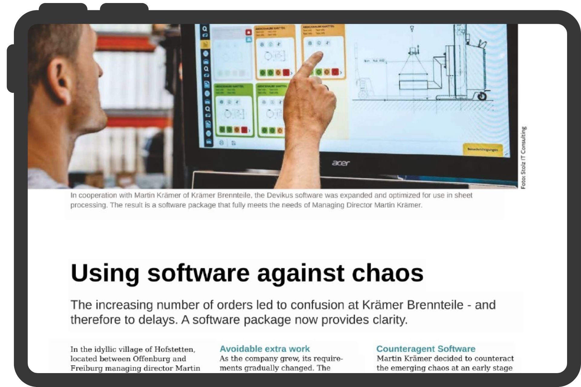In cooperation with Krämer Brennteile, Hofstetten, the DEVIKUS software has been expanded and optimised for use in sheet metal processing. Find out how DEVIKUS enables a more efficient and transparent production - thus increasing quality and yields while reducing costs.